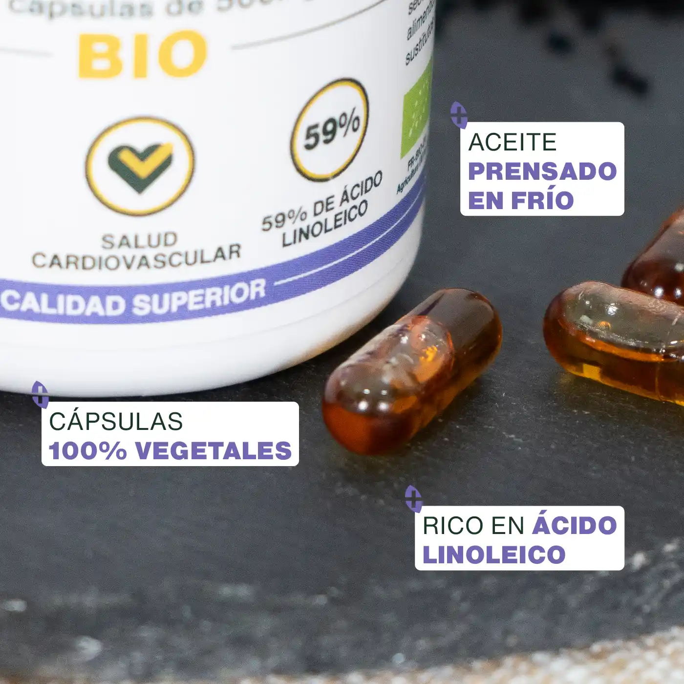 RICO EN OMEGA-6, UN 59% DE ÁCIDO LINOLEICO: nuestras cápsulas de Aceite de Comino Negro Bio son ricas en omega-6, ácidos grasos esenciales que el cuerpo no puede producir por sí mismo y que suelen ser escasos en nuestra alimentación moderna. Gracias a su alta concentración en ácido linoleico (59%), nuestras cápsulas aportan 885 mg diarios de este valioso ácido graso, una dosis óptima para garantizar eficacia y beneficios reales.