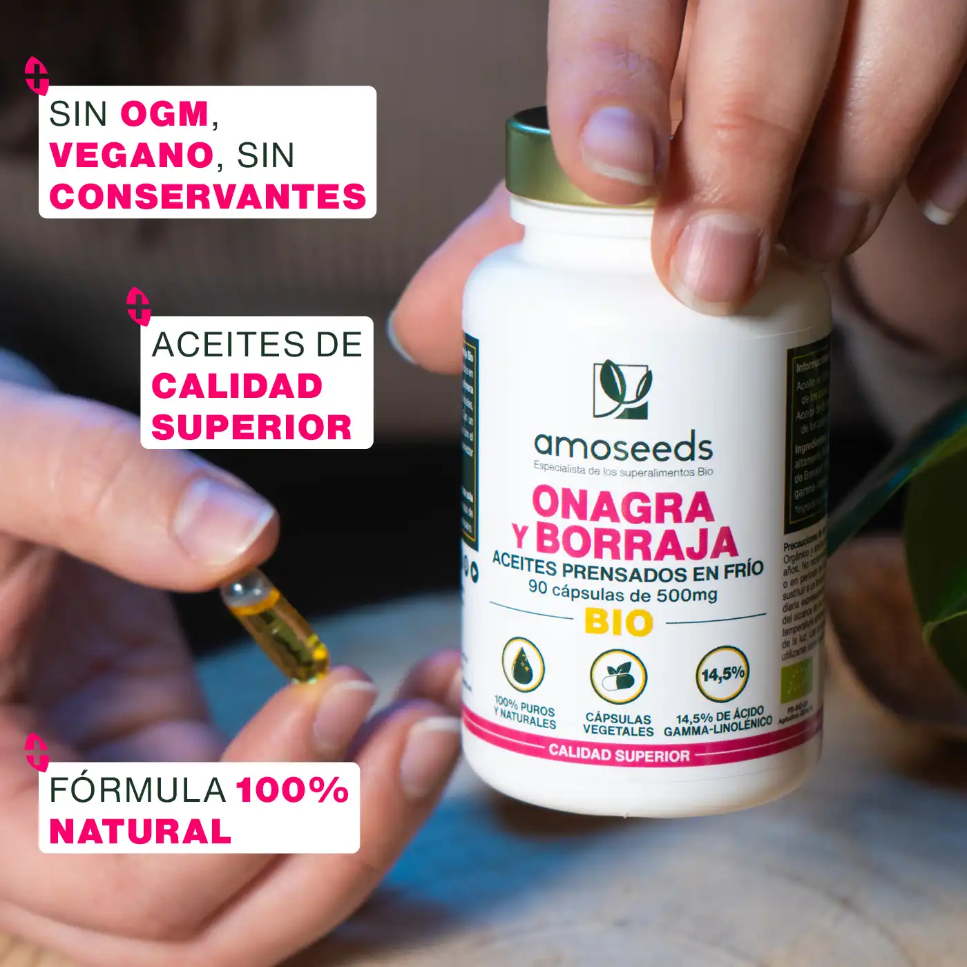 CÁPSULAS 100% VEGETALES INNOVADORAS: en un contexto donde las alternativas vegetales siguen siendo limitadas en el ámbito de los suplementos alimenticios a base de aceites, Amoseeds innova ofreciéndote un producto 100% vegetal. Gracias a nuestra técnica avanzada de encapsulación, sin gelatina animal, garantizamos un complemento perfectamente adaptado a dietas vegetarianas y veganas. Formuladas con aceites orgánicos de Onagra y Borraja, nuestras cápsulas garantizan una pureza óptima y cumplen con los más altos estándares de calidad, proporcionando una solución natural y accesible a todos los públicos.
