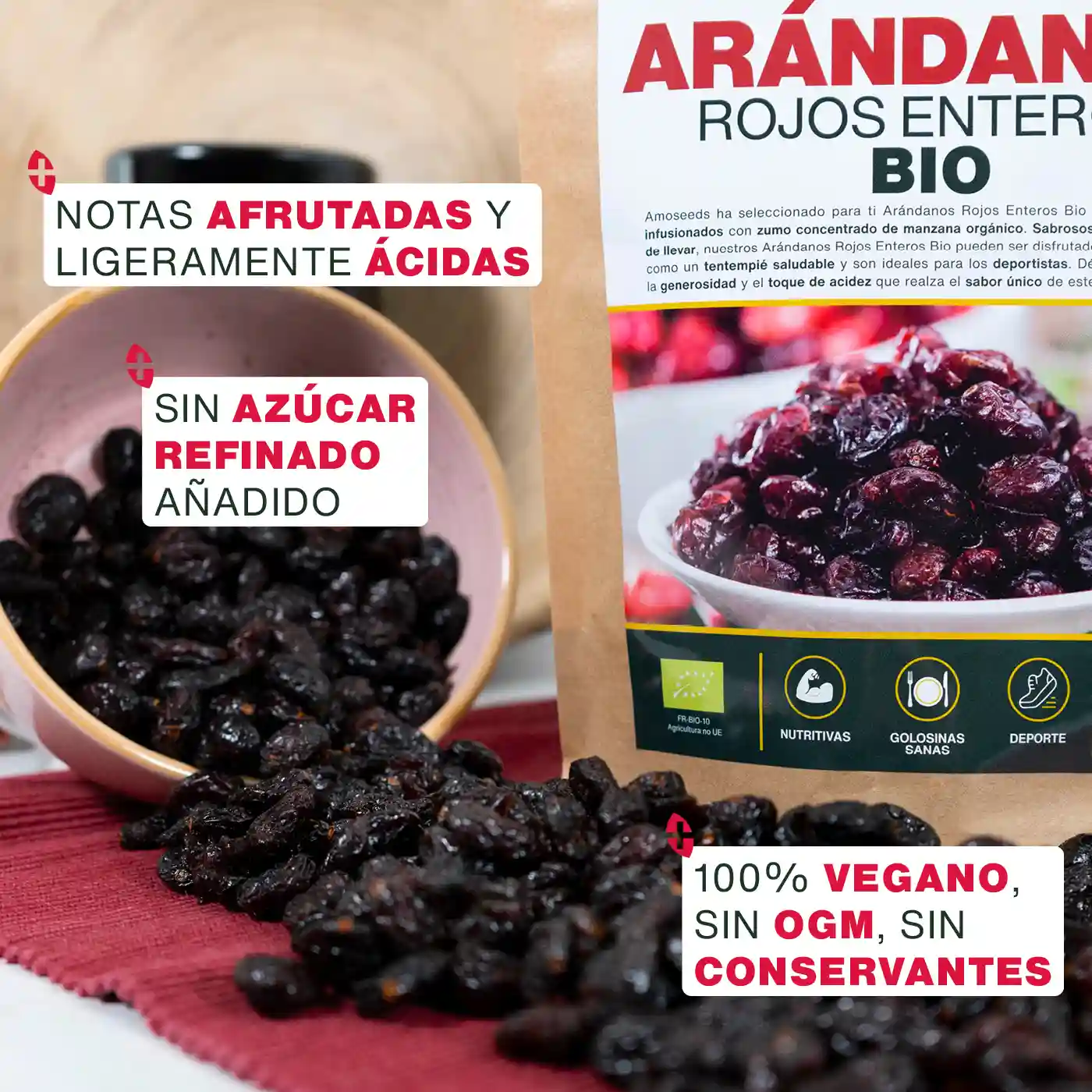 - CERTIFICADOS ORGÁNICOS: bolsa kraft resellable y reciclable de 1kg de Arándanos rojos orgánicos de calidad superior amoseeds. Producto 100% natural, puro, vegano, sin conservantes, sin OGM, sin pesticidas, sin colorantes artificiales, sin lactosa, sin soja y sin gluten. Cada lote es analizado por terceros para garantizar su calidad y pureza.