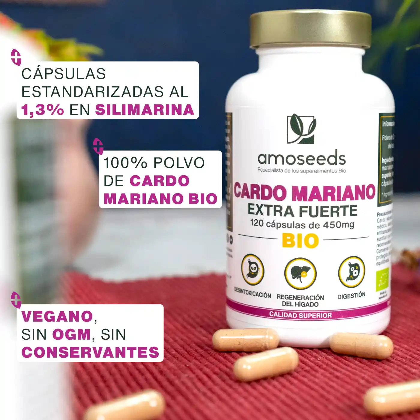 - CERTIFICADO ORGÁNICO: frasco reciclable y resellable con 120 cápsulas que contienen 450mg de polvo de Cardo Mariano Orgánico de calidad superior. Producto 100% puro, vegano, sin aditivos, sin conservantes, sin OMG, sin pesticidas, sin colorantes artificiales, sin gluten y sin lactosa. Cada lote es analizado por terceros para garantizar su calidad y pureza. Analizado, fabricado y envasado en Francia.
