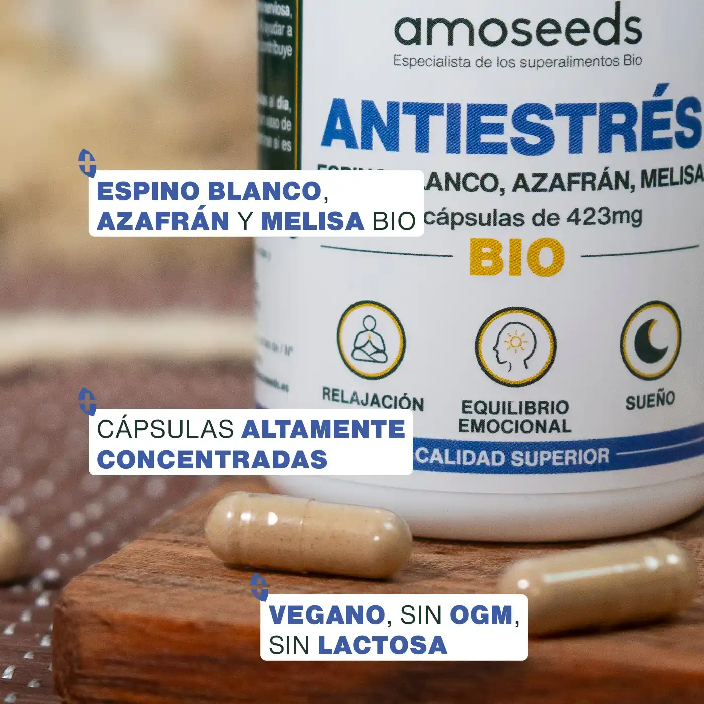- CERTIFICADO ORGÁNICO: frasco reciclable y resellable con 90 cápsulas de 423mg de polvo de partes aéreas de Espino Blanco Orgánico de calidad superior, extracto de hoja de Melisa Orgánica de calidad superior y extracto de estigma de Azafrán Orgánico de calidad superior Amoseeds. Producto 100% puro, vegano, sin solventes, sin óxido de etileno, sin aditivos, sin conservantes, sin OMG, sin pesticidas, sin colorantes artificiales, sin lactosa, sin soja, sin gluten. Cada lote es analizado por terceros para garantizar su calidad y pureza. Plantas analizadas, fabricadas y envasadas en Francia.