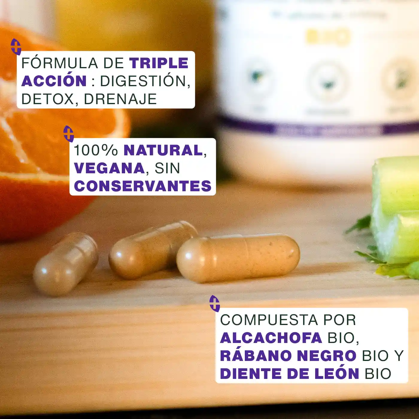 DRENAJE, DESINTOXICACIÓN: gracias a una asociación inteligente de alcachofa, rábano negro y diente de león, nuestro complejo Detox Hígado Bio tiene grandes propiedades desintoxicantes. Al favorecer la producción de líquidos digestivos por el hígado y la eliminación de agua por los riñones, nuestro Complejo Detox Hígado Bio ayuda a drenar el organismo y favorece la eliminación de toxinas sin problemas. Esta combinación de superalimentos es ideal para cualquier persona que desee iniciar un tratamiento de desintoxicación.