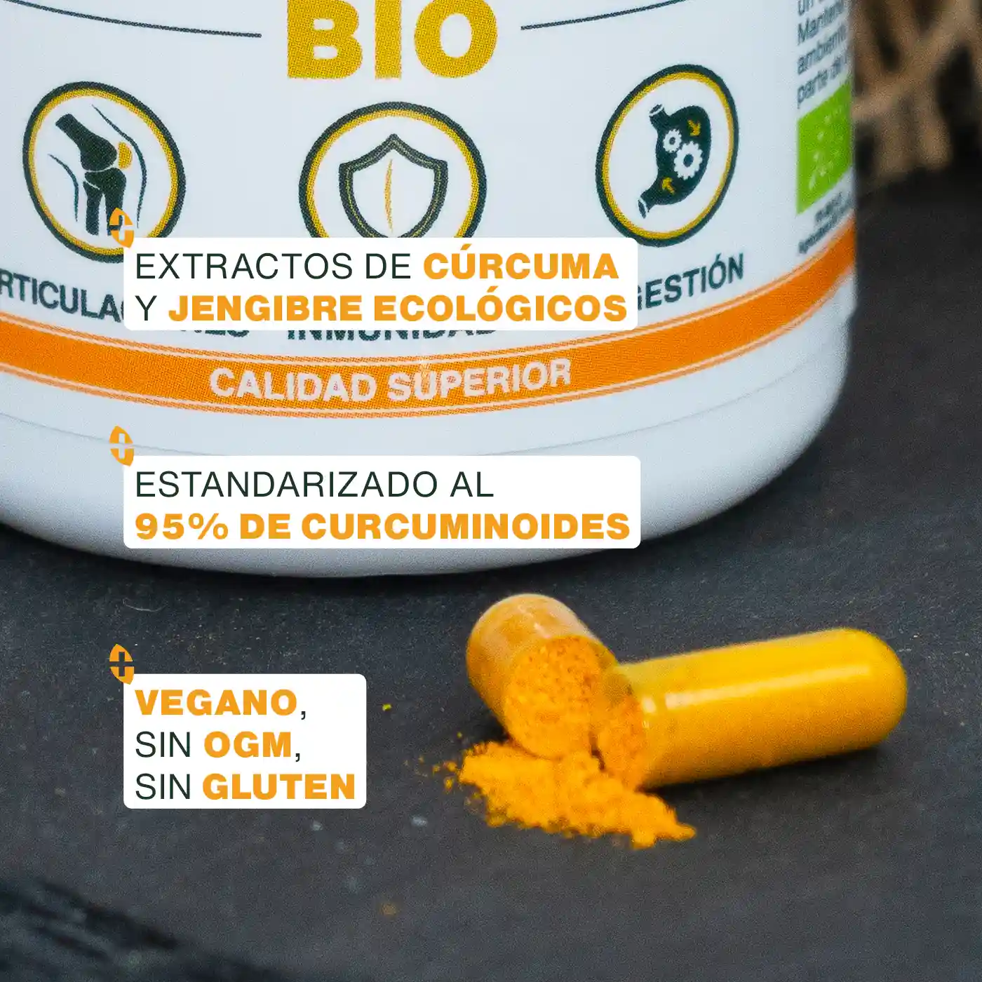 FÓRMULA ALTAMENTE EFICAZ Y CONCENTRADA: hemos desarrollado una fórmula única y altamente concentrada a base de Cúrcuma y Jengibre Bio para permitirte beneficiar de una alta eficacia. Nuestra fórmula contiene extracto de Cúrcuma Orgánica titulada al 95% de curcuminoides (de los cuales 87,4% de curcumina), combinado con Cúrcuma en polvo Bio para aumentar el potencial de nuestro producto. También hemos añadido extracto de Jengibre Bio para potenciar los beneficios de la Cúrcuma Bio, y aceite de MCT orgánico en polvo para mejorar la absorción de la curcumina. Combinando estos 4 ingredientes 100% naturales y orgánicos, te garantizamos un efecto beneficioso para el bienestar de tus articulaciones, tu digestión y tu salud cardiovascular.