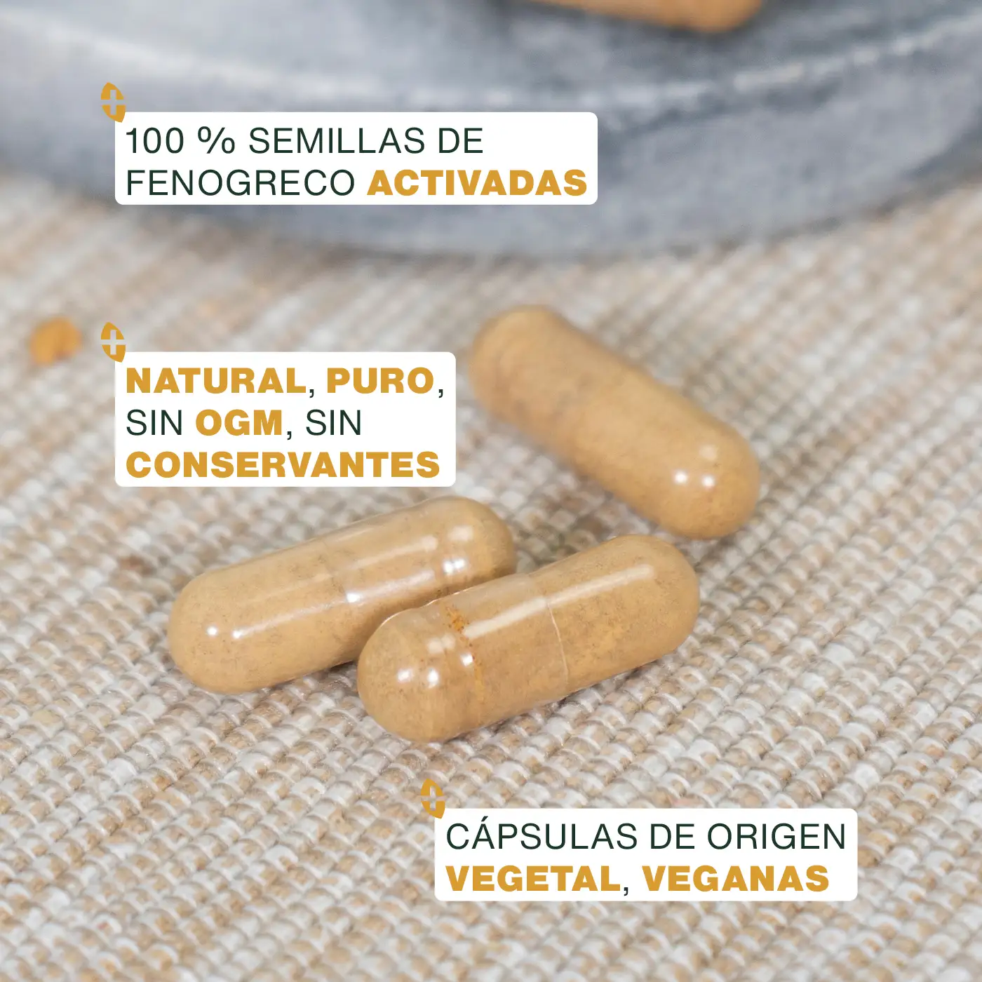FENOGRECO ACTIVADO, MÁXIMA EFICACIA: para ofrecerte un complemento eficaz, seguro y altamente concentrado, hemos optado por utilizar semillas de fenogreco “activadas”. Estas pasan por un proceso natural de remojo y germinación, antes de ser deshidratadas a baja temperatura y molidas hasta obtener un polvo fino. Este método permite conservar todas las propiedades nutricionales de las semillas, en especial su contenido en saponinas, los compuestos activos más valorados. Luego, el polvo se encapsula en cápsulas vegetales fáciles de tomar cada día.