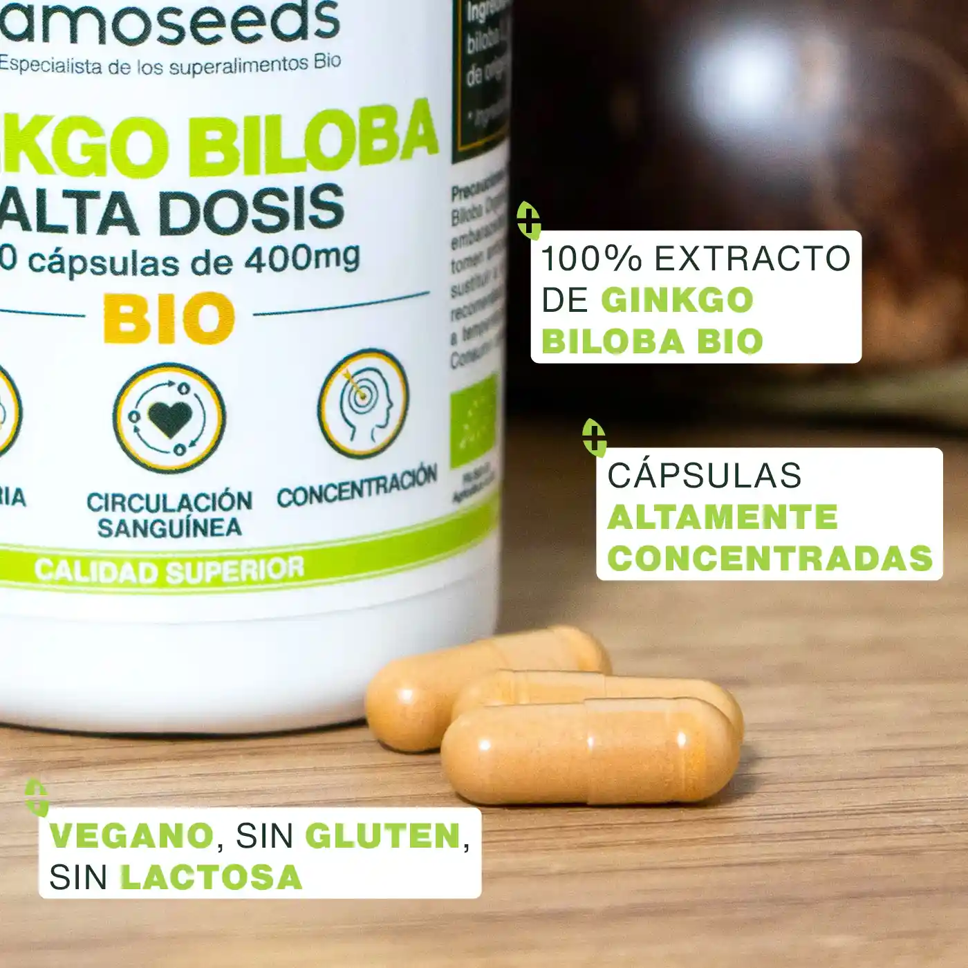 EXTRACTO DE CALIDAD SUPERIOR: con el fin de ofrecerte la mayor calidad y eficacia posibles, Amoseeds ha seleccionado un extracto de Ginkgo Biloba orgánico de primera calidad. Obtenido mediante un proceso de extracción que utiliza únicamente agua, nuestro extracto no contiene ningún disolvente químico. Nuestras cápsulas de Ginkgo Biloba Bio son por tanto altamente concentradas y de una gran pureza, lo que te permite beneficiarte de la mayor eficacia.