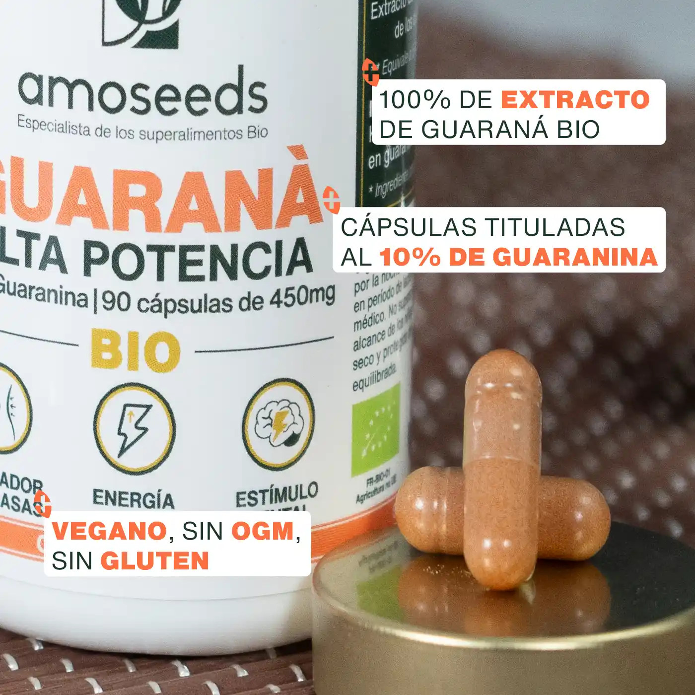 - CERTIFICADO ORGÁNICO: frasco reciclable y resellable con 90 cápsulas de 450mg de extracto (4-5:1) de Guaraná orgánico de calidad superior Amoseeds titulado al 10% de guaranina. Producto 100% puro, vegano, sin aditivos, sin conservantes, sin OMG, sin pesticidas, sin colorantes artificiales. Cada lote es analizado por terceros para garantizar su calidad y pureza. Producto analizado y envasado en Francia.