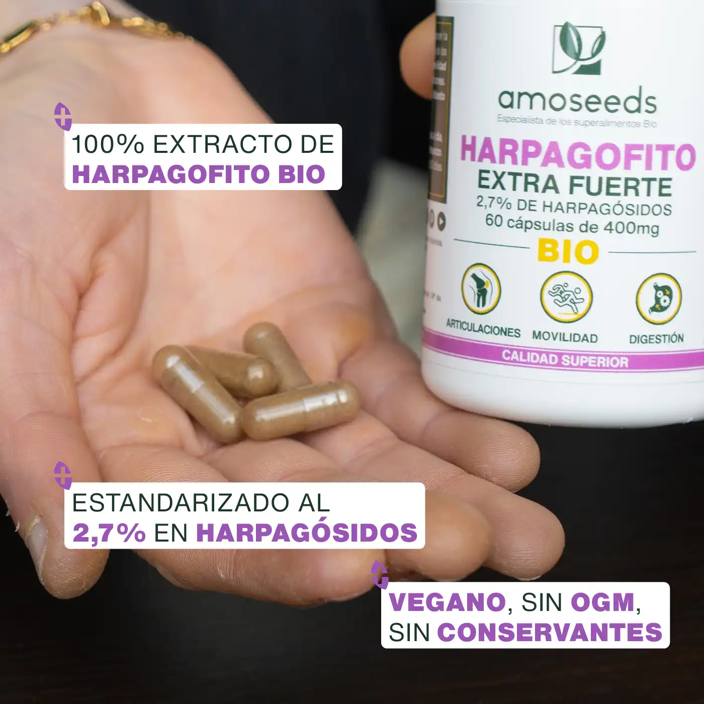 EFICACIA, EXTRACTO TITULADO AL 2,7% DE HARPAGÓSIDOS: nuestro Harpagofito Bio ha sido extraído de tal manera que nuestras cápsulas contienen un máximo de principios activos. Para que te beneficies de la mayor eficacia y calidad posibles, hemos seleccionado un extracto de Harpagofito Bio titulado al 2,7% de harpagósidos, los principios activos que constituyen la fuente principal de las virtudes del Harpagofito. Nuestro extracto posee la concentración más elevada del mercado para un producto de calidad orgánica, lo que le permite actuar eficazmente sobre el confort articular y digestivo, para un bienestar general cotidiano.