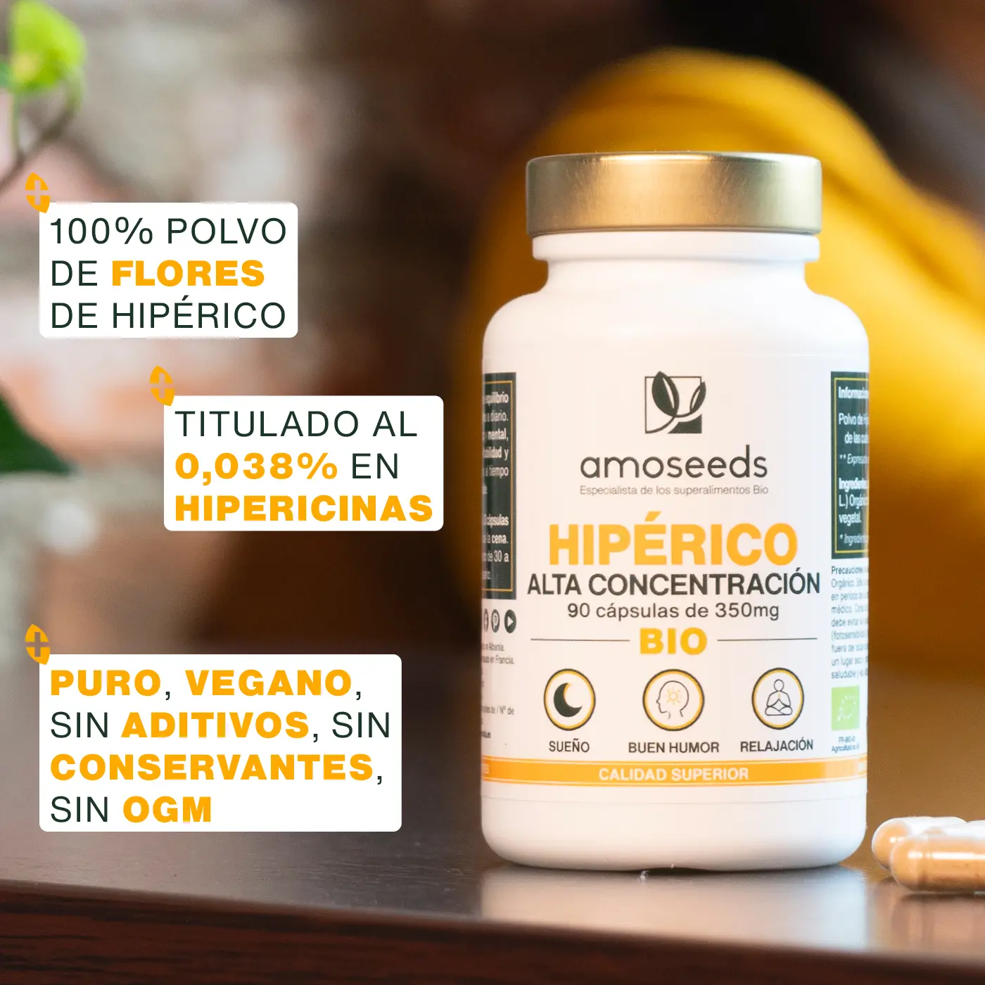 Nuestras cápsulas se han formulado a partir de polvo de Hipérico orgánico de alta calidad, titulado al 0,038% de hipericinas totales, para que puedas beneficiarte de todas sus virtudes. Conocido por su efecto beneficioso sobre el equilibrio emocional, este superalimento, también conocido como hierba de San Juan, ayuda a mejorar el estado de ánimo a diario. Tomado como parte de tratamientos puntuales, nuestro Hipérico Bio será ideal para calmar los cuerpos estresados y tensos, así como para ayudar a recuperar un sueño reparador.