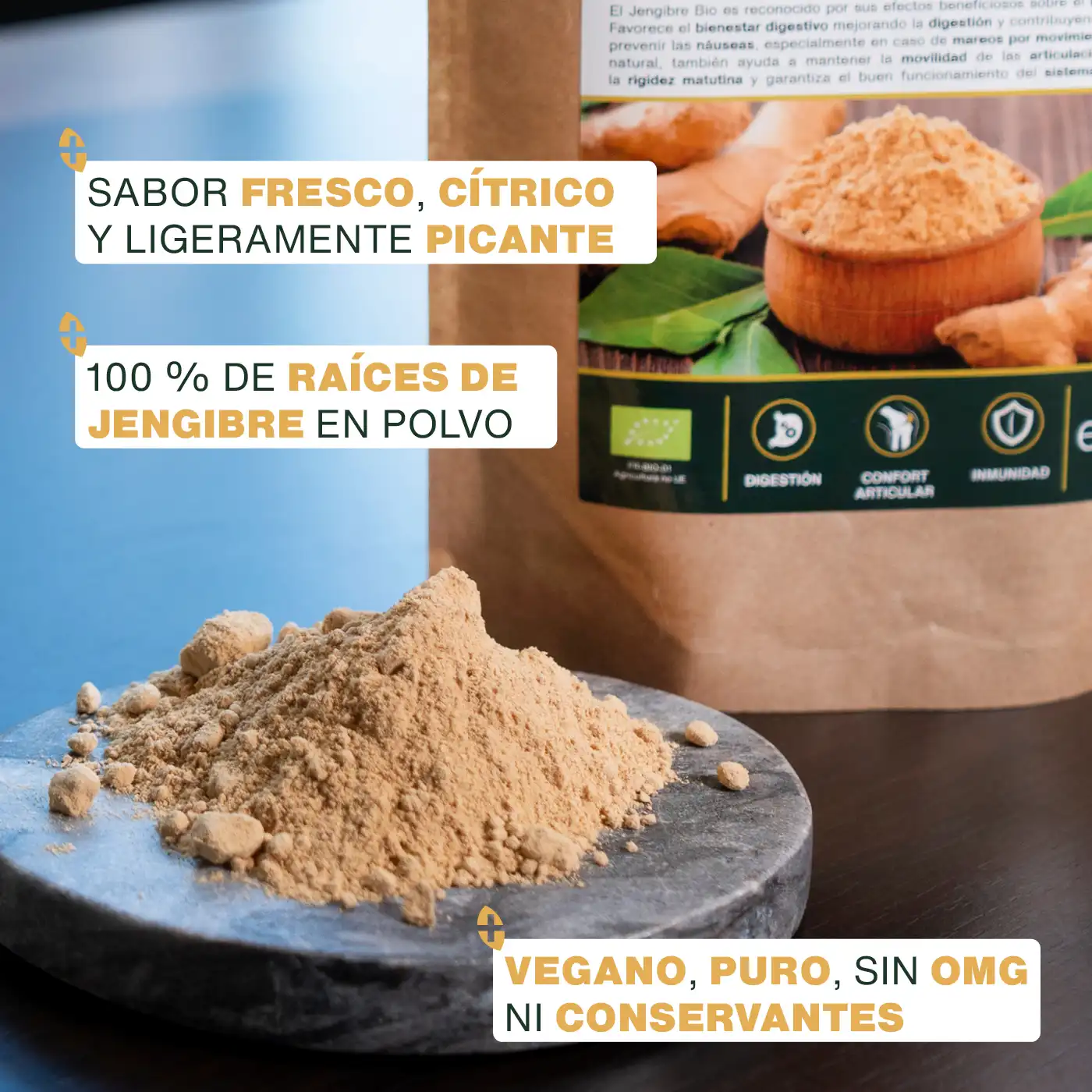 El Jengibre Bio es reconocido por facilitar la digestión, combatir las náuseas y mejorar el confort articular, lo que lo convierte en el superalimento ideal para mejorar tu bienestar diario. Para facilitar su consumo y añadir un toque de originalidad a tus preparaciones culinarias, te proponemos Jengibre en polvo Bio con un sabor fresco y potentes aromas, realzados por sus notas picantes y alimonadas.