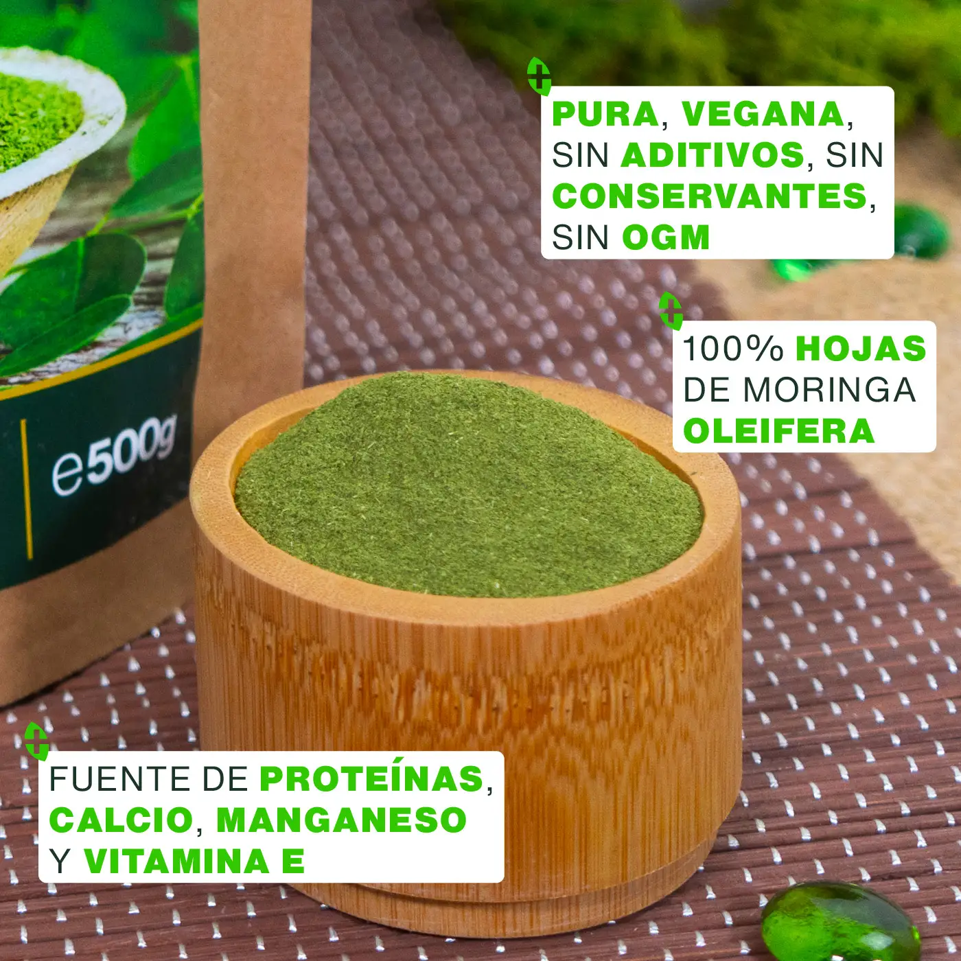 NUTRICIÓN, SALUD: nuestra Moringa Bio tiene unas propiedades nutricionales excepcionales, por lo que es una excelente elección para cualquier persona que quiera cuidar de su salud, especialmente vegetarianos, veganos y deportistas. Es rica en proteínas (27,1g/100g) y fibra (6,7g/100g), además de ser fuente de calcio (1290mg/100g), manganeso (4,28mg/100g) y vitamina E (113mg/100g). Por lo tanto, contiene buenas cantidades de los nutrientes que necesita el organismo, lo que es poco frecuente en una planta. Contribuye a la construcción, regeneración, buen funcionamiento y protección del organismo, manteniéndolo en buen estado de salud durante todo el año.