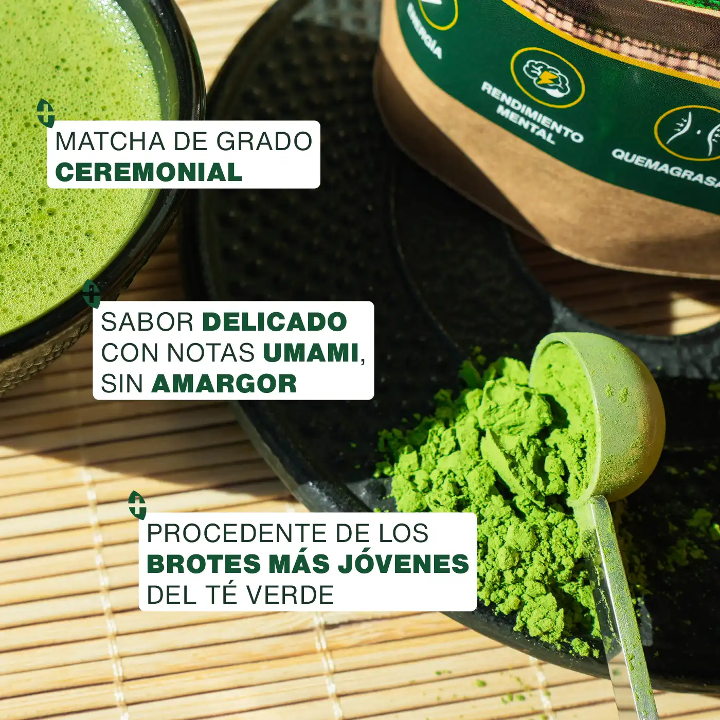 ENERGÍA, VITALIDAD: utilizado desde hace muchos años como tónico natural, el Té Matcha es un superalimento ideal para cualquier persona que desee sentirse más energética. Consumido regularmente, te ayudará a combatir la fatiga, tanto física como mental, y a fortalecer tu organismo en profundidad. Verdadero estimulante, se recomienda a quienes desean mantener un bienestar general durante todo el año y mejorar su productividad a diario.